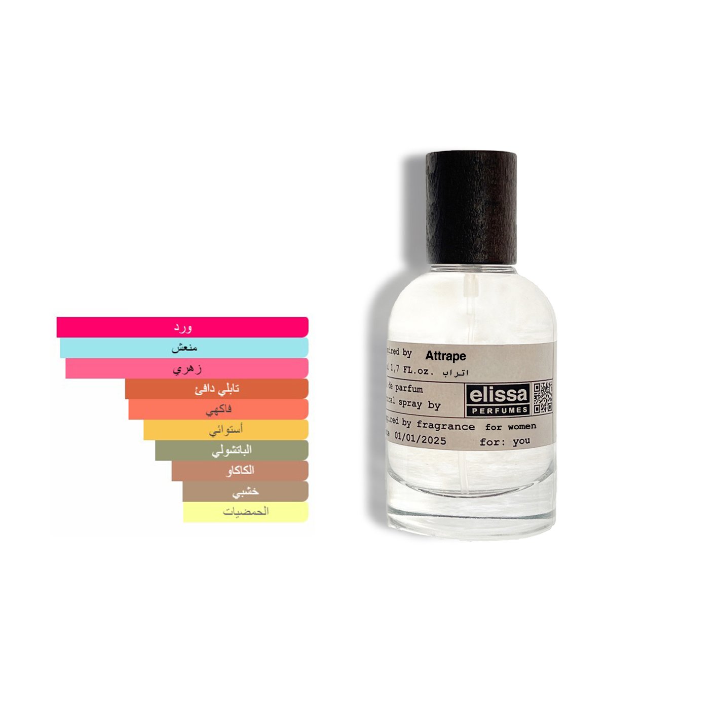 يفتتح العطر بمزيج منعش من الليتشي والبرغموت مع لمسة زنجبيل ناعمة توقظ الحواس وتمنحك بداية مشرقة. في قلب العطر تتفتح نغمات الفاوانيا والورد التركي ممزوجة برقة الكاكاو لتمنحك توازناً بين الأنوثة والدفء. وتستقر القاعدة على عمق الباتشولي، لتترك أثراً لا يُنسى يعبر عن شخصيتك القوية والرقيقة في آنٍ واحد.